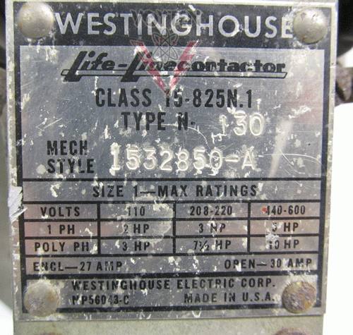 WESTINGHOUSE LIFE-LINECONTACTOR, CLASS 15-825N.1, TYPE N-130M, SIZE 1, MAX VOLTS 600, 1 PHASE MAX 3 H.P., POLY PHASE 10 H.P., ENCLOSED 27 AMP, OPEN 30 AMPS, MECH STYLE # 1532850-A