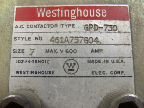 WESTINGHOUSE A.C. CONTACTOR, TYPE GPD-730, SIZE 7, MAX VOLTS 600, COIL= 110/120 VAC, 50/60Hz, NEMA 7-8, GCA/GPD Coil, COIL CAT # 438C805G12, STYLE # 461A757G04