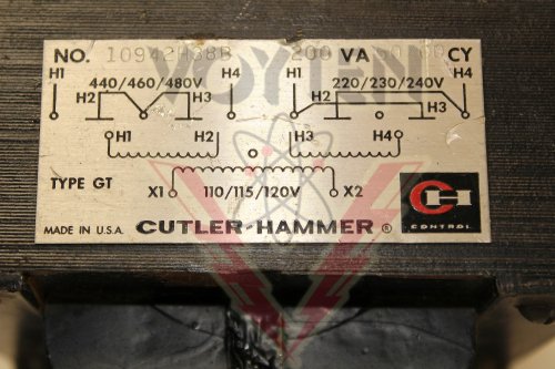 CUTLER-HAMMER, GT CONTROL POWER TRANSFORMER, 200 VA 50/60Hz PRI. V. 440/460/480 220/230/240 SEC. V. 110/115/120, CAT# 10942H38B