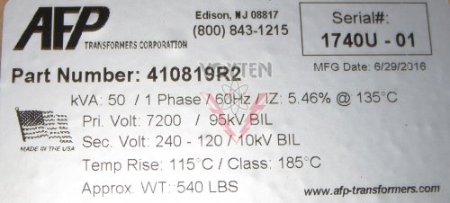 AFP Transformers Corporation, kVA 50 / 1 Phase / 60Hz / IZ: 5.46% @ 135C, Pri. Volt: 7200 / 95kV BIL, Sec. Volt; 240 - 120 / 10kV BIL, Cat# 410819R2