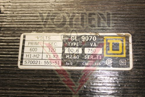 SQUARE D, EO-6 CONTROL POWER TRANSFORMER, SERIES T1, PRI. VOLTS: 600V, SEC. VOLTS: 120V, 60HZ, VA: 750, CAT# 9070-EO-6