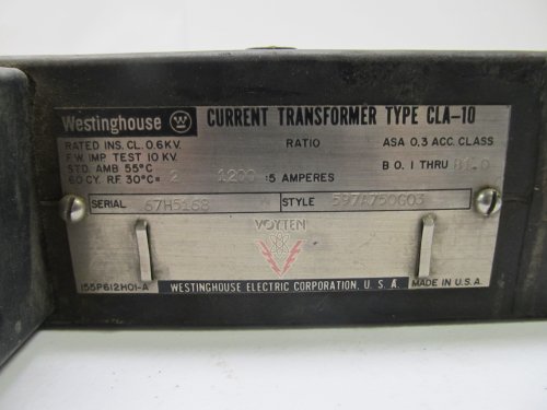 597A750G03 CT by Eaton, Cutler Hammer or Westinghouse WESTINGHOUSE CURRENT TRANSFORMER TYPE CLA-10 RATIO 1200:5 A RATED INS. CL 0.6 KV F.W. IMP. TEST 10 KV 60 HZ CAT# 597A750G03 Reconditioned Inventory Code: H Make an Offer Send to a Friend WEIGHT: 12 HEIGHT: 8" WIDTH: 8" WINDOW WIDTH: 5 1/2" TYPE: CLA-10 RATIO: 1200:5 WHSE: BSK#10, BSK# 19, BSK# 51 Return To Electrical Transformers
