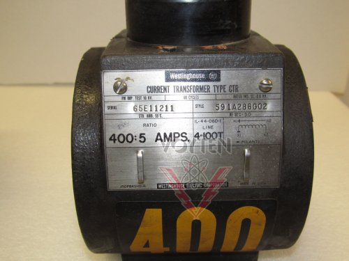Westinghouse, CTR Current Transformer, IC 0.6 KV, FW IMP. Test 10 KV. 60Hz, STD. AMB. 55C,RF 30C=3.0, Ratio 400:5 Amps, Height W/Cap 6.75", Height W/Out Cap 5.75", Width 5.25", Window Width 2.75", Cat# 591A286G02
