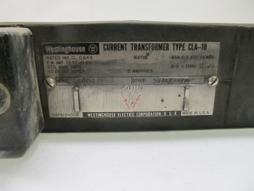 WESTINGHOUSE CURRENT TRANSFORMER TYPE CLA-10 RATIO 1500:5 A RATED INS. CL. 0.6 KV F.W. IMP. TEST 10 KV. 60 HZ CAT# 597A750G04