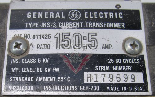 671X25 CT by General Electric GENERAL ELECTRIC CURRENT TRANSFORMER TYPE JKS-3 RATIO 150:5 A INS CLASS 5 KV. IMP. LEVEL 60 KV FW 25-60 HZ WIDTH 4 1/8" LENGTH 14" HEIGHT 8" CAT# 671X25 Make an Offer Send to a Friend WEIGHT: 33 HEIGHT: 8" WIDTH: 4 1/8" WINDOW WIDTH: 14" WITH BARS TYPE: JKS-5 RATIO: 150:5 IC KV : 5 Return To Electrical Transformers