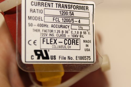 FLEX-CORE, CURRENT TRANSFORMER, RATIO 1200:5A, 50-400HZ ACFC 1%, THER. FACTOR 1.25 @ 30C, 1.0 @ 55C, 720V INS. CLASS - 10kV BIL, DONUT TYPE, CAT# FCL1200-5-4 OR FCL1200/5-4