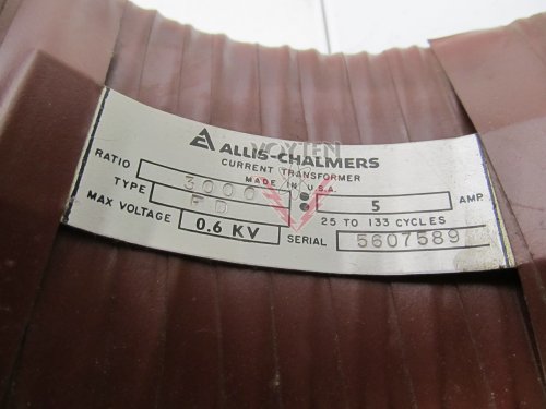 FD-3000 CT by Allis Chalmers ALLIS CHALMERS CURRENT TRANSFORMER TYPE FD RATIO 3000:5 A MAX VOLTAGE 0.6 KV 25 TO 133 HZ CAT# FD-3000 Reconditioned Inventory Code: C Make an Offer Send to a Friend WEIGHT: 28 HEIGHT: 9 1/2" WIDTH: 9 1/2" WINDOW WIDTH: 7 1/4" TYPE: FD RATIO: 3000:5 IC KV : 0.6 KV WHSE: BSK# 10 Return To Electrical Transformers