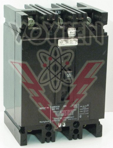 WESTINGHOUSE CIRCUIT BREAKER 30 AMPS 3 POLES 480 VAC CAT# EHB3030 STYLE# 4989D52G37