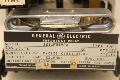 General Electric Relay Frequency Relay, 115 Volts, Close Left 57 Cycles Close Right Cycles, Use EXT CAP. 21L6804 GUA. 643 CAT # 12IJF51B2A