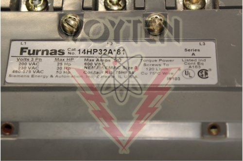 14HP32A*81 STARTER BY FURNAS FURNAS, STARTER, SERIES A, 90 AMPS MAX, 600VAC, NEMA SIZE 3, COIL: 110/120V, CAT# 14HP32A*81 Reconditioned Inventory Code: A Make an Offer Send to a Friend WHSE Code: HALLWAY SEC. G SHELF 1 Return To Motor Controls