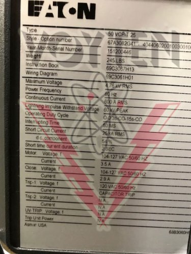 Eaton Vacuum Breaker 5kV, 600A CAT#50VCP-T25